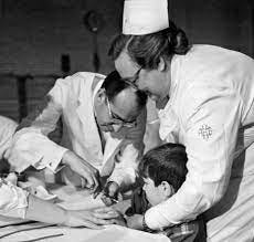 On February 23, 1954, a group of children from Arsenal Elementary School in Pittsburgh, Pennsylvania, receive the first injections of a new polio vaccine developed by Dr. Jonas Salk. I had only just turned six myself. But I was old enough to know all about that crippling disease. It spread fear and worry throughout entire communities, over risk of contamination; especially in Summertime, in places like the public swimming pool.