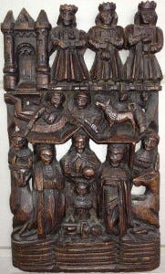 When I was once a young cleric beginning a professional career in a posh Southern California parish there was a charming older couple that were amused by some of my upstart theological notions. In appreciation, they gifted me with a mid-17th century English wood carving of the Holy Nativity. Clustered around a rather crude rendition of a babe in a manger are Joseph and Mary, ox and ass, three crowned kings, and angels circling over the parapets of a medieval castle.