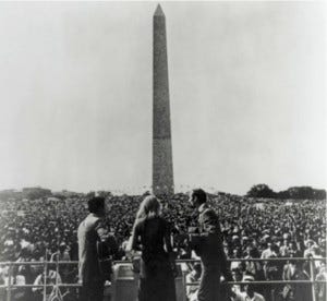 So, for example, as I wrote this commentary I sought to find the right words to express my thoughts and feelings as our nation was preparing to observe the 50th anniversary of the historic civil rights March on Washington from 1963, and the remembrance of a social prophet and Christian preacher’s who not only had a dream, but found those memorable words to express it. A commentator this week made the observation we have all too easily forgotten that the two-fold purpose for the non-violent demonstration was to not only demand legislative action to make good on what Martin Luther King called a “bad check” that had too long gone un-cashed with regard to full and equal freedoms for all our citizens. It was also a very practical demand for economic justice through job creation on a shared, collective and national level. Now, as we crawl out of another economic recession half a century later, the disproportionate number of unemployed African-Americans raises an obvious point. One commentator this last week wondered if another 50 years would pass before we saw a sea change in this regard. Discussing all this with a colleague the other day, he remarked “It’s OK to have a dream, but dreams are cheap, and don’t require a budget.” I recalled the line from scripture about that perpetual season of a hopeful future where old men will dream dreams, and young men see visions. And I thought of instances of those realized dreams and visions with all the social and spiritual prophets down through the ages; from the Old Testament prophets and the Galilean sage, to Ghandi, and King, and the like. And so I thought for a moment, and then replied to my friend, “It seems as though prophets are always said to have offered up religious-sounding dreams and visions, where for sake of convenience we prefer to believe it’s all merely to be taken as myth and metaphor. But, in reality, they actually meant their words to be taken literally for a change!” Double entendre intended. And, because the times are always supposed to be about change – from the way things are to the way things ought to be – it seems to me we need to always ask what language we might now employ to describe a different kind of “God?” What might be that Otherness yet to be known and realized? I am old enough to remember the original March on Washington. I was a guitar-strumming boarding school student, trying to imitate the poets and troubadours of our new changing world. I remember listening over and over to the old vinyl LP album of Peter, Paul and Mary singing songs before a sea of people on the Washington Mall one hot August day in 1963. I remembered the photograph on the back of the album cover, we found ourselves re-telling this old story once again.